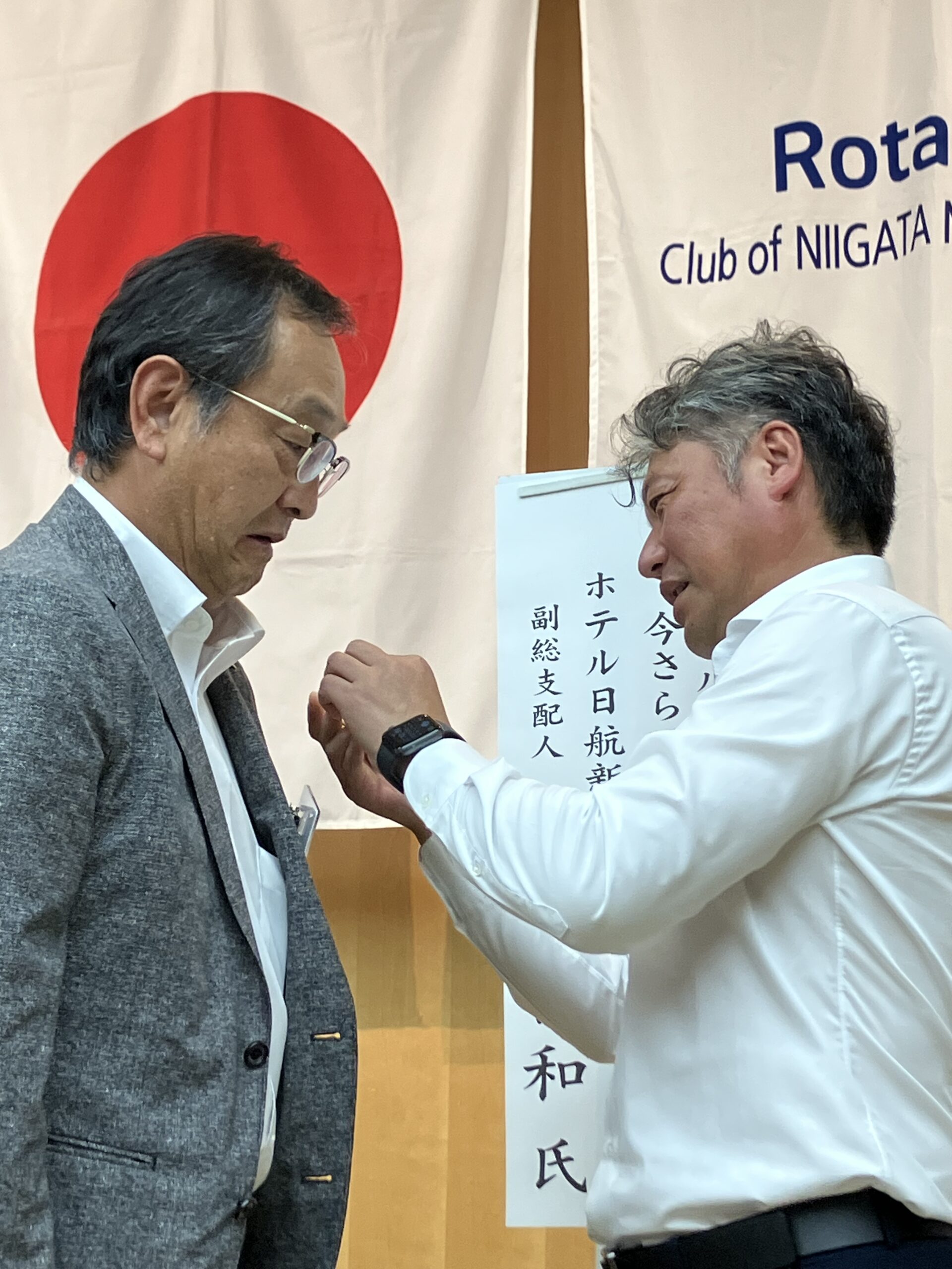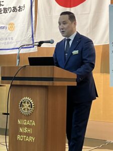 渡辺文司さんは、公共施設などの建築企画・設計・管理を手がける株式会社コンフォルトの代表取締役です。村上市の旧山北町で生まれ、現在は五泉市内の自宅から新潟市中央区桜木町の事務所に毎日通っているそうです。渡辺さんの入会により、新潟西RCの会員は過去最多に並ぶ57人となりました!