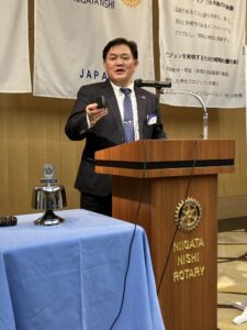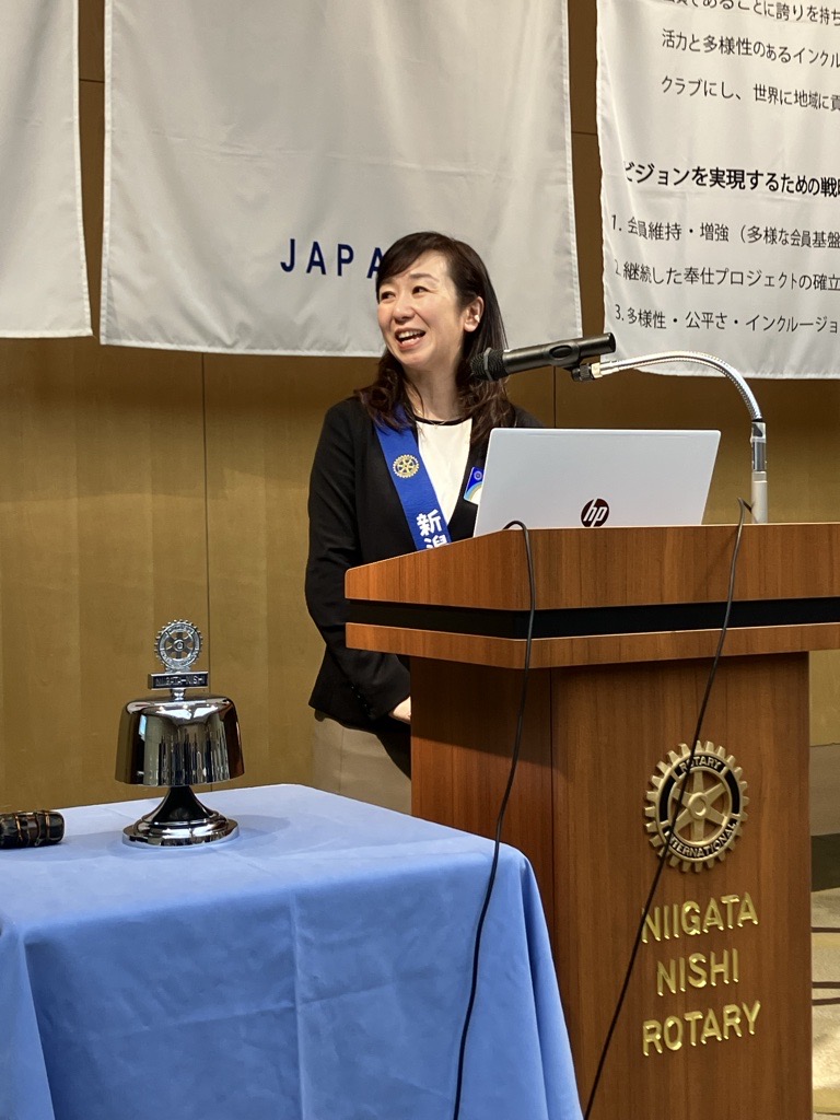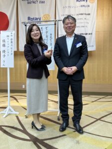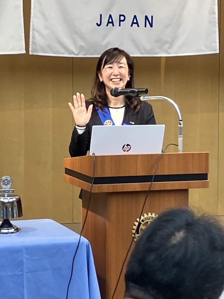 きょうの卓話は去年7月に入会し、親睦委員として大活躍中の佐藤優子さんです。プロフィールと会社についてお話しいただきました。