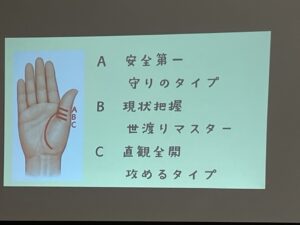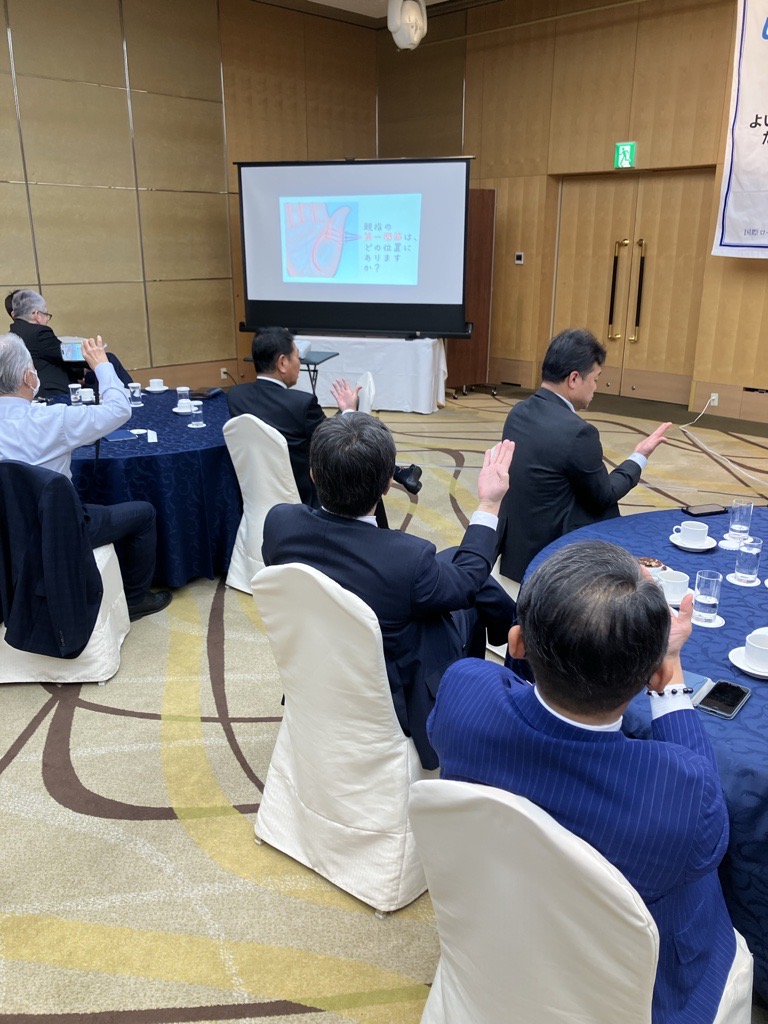 2人のお子さんが成長し、ここ数年はようやくやりたいことをする時間が持てるようになったといいます。趣味はゴルフ、釣り、山菜採りと多彩で、「YUURI AMASAKI」の名前でタロット占い、手相占いをする「占い師」の顔も。この日の卓話ではメンバーの皆さんの手相を占っていただきました。