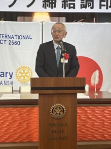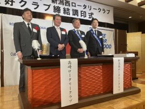 高崎RCと新潟西RCは、今後、友好クラブとして新たな交流の歴史を刻むことになります。本日の調印に向けてご尽力いただいた高崎RCの皆様、新潟万代RCの新保清久パストガバナーをはじめ、関係の皆様に対し、新潟西RCの会員一同、心より感謝申し上げます。