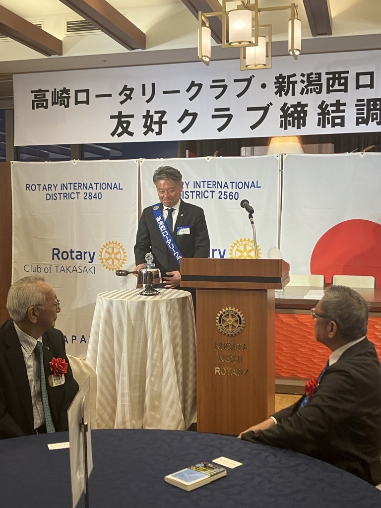 高崎RCと新潟西RCは、今後、友好クラブとして新たな交流の歴史を刻むことになります。本日の調印に向けてご尽力いただいた高崎RCの皆様、新潟万代RCの新保清久パストガバナーをはじめ、関係の皆様に対し、新潟西RCの会員一同、心より感謝申し上げます。